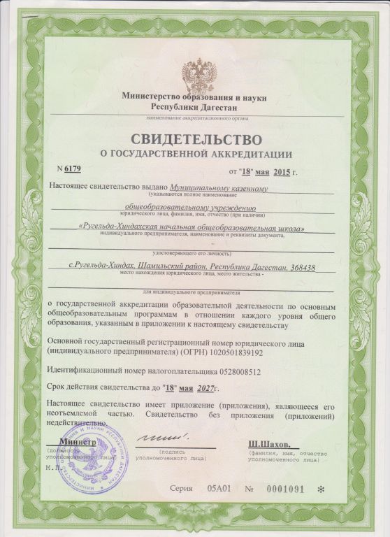 | Полное наименование образовательной организации* | Муниципальное казенное общеобразовательное учреждение"Ругельда-Хиндахская НОШ" |